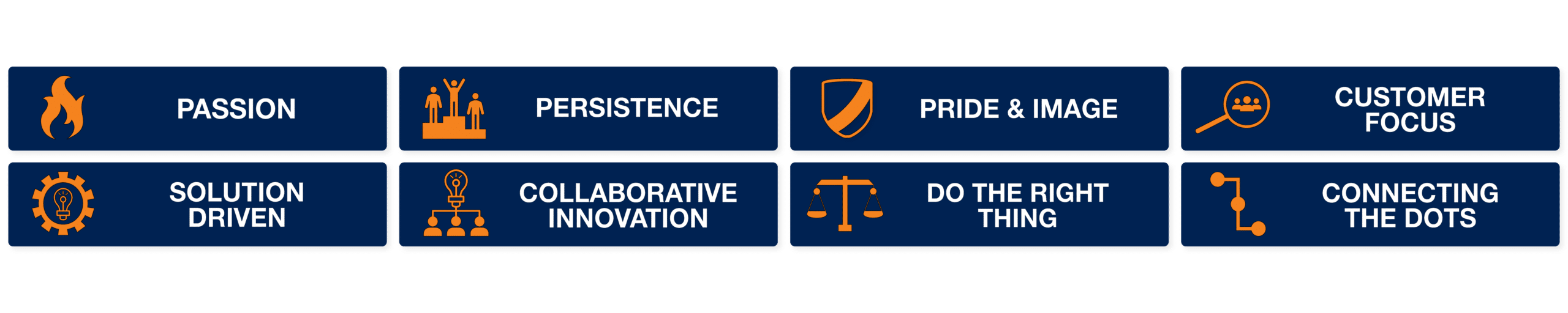 Passion. Persistence. Pride and Image. Customer Focus. Solution Driven. Collaborative Innovation. Do the Right Thing. Connecting the Dots.